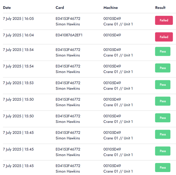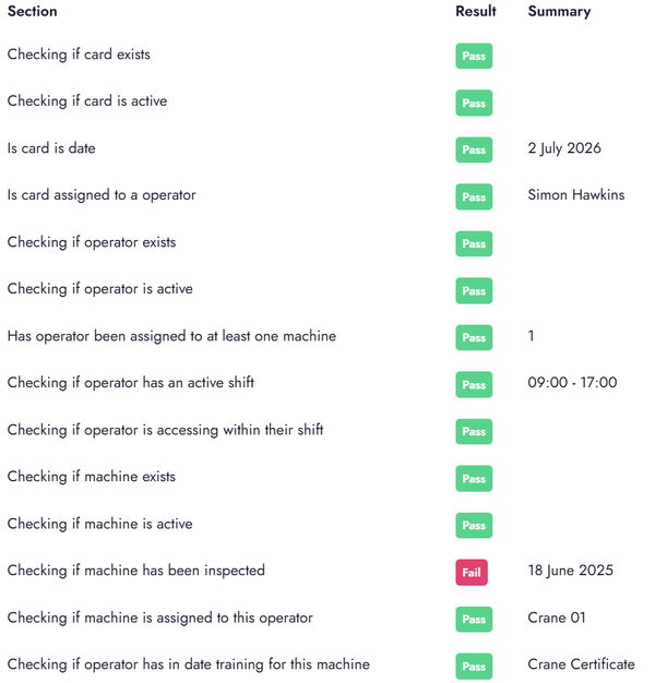 The Hub does loads of checks to see if the card is valid, active, the machine is active, if the card is assigned to an operator, if the operator has training for this machine, if this is the operator's shift, has the machine been inspected and many others. If it passes everything then an acknowledgement is passed back to the transmitter allowing control over the machine.